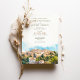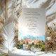 Célébrez votre journée spéciale avec cette exquise invitation de mariage de destination avec le paysage enchanteur de Sienne, Italie. Le design présente une étonnante aquarelle illustrant l'horizon historique de Sienne, avec ses dômes et tours emblématiques nichés au milieu d'une végétation luxuriante. Le texte est présenté avec élégance dans un mélange de polices de serif classique et de caractères délicats, avec des couleurs allant de l'or muté et vert olive à la terre cuite chaude. Parfait pour les couples qui souhaitent un mariage italien romantique, cette invitation allie élégance intemporelle et charme rustique.