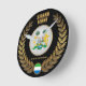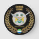 Das nationale Wappen Sierra Leones ist Set auf schwarzem Grund. Das Emblem wird in eine goldgerippte Kreissage in einem Imitat eingegossen, die wiederum in der Mitte eines Imitats goldenen Lorbeerkranzes verschlungen ist. Am Fuß des Kranzes befindet sich die Nationalflagge, die in einen Kreis eingedrungen ist, der Teil des Kranzes ist. Das Design wird durch den Ländernamen ergänzt, der auch in Imitat Gold ist.