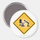 Aimant frigo rond d'un panneau d'avertissement de circulation jaune avec une icône vomissant au-dessus d'une toilette montrant une gueule de bois.