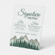 Dieses Tafelschild eignet sich perfekt für die Bar an Ihrem Hochzeitsempfang. Es zeichnet sich durch ein einfaches Design mit rustikalen Aquarellen von Kiefern und Bergen in Schattierungen von Waldgrün. Das Schild lautet: Signature Drinks, und es gibt Platz für seinen Favoriten und ihren Favoriten.