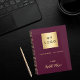 Un arrière - plan bordeaux. Personnalisez et ajoutez votre entreprise, le logo de l'entreprise, un texte, l'année et le nom personnel. Lettres d'or. Si vous le souhaitez sans texte, utilisez votre touche back-space pour supprimer. Ajoutez votre propre adresse de site web au verso.