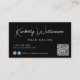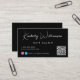 Eine schicke schwarze Visitenkarte mit Ihrem Namen oder Ihrer Marke, die in einem stilvollen weißen Signaturskript und Geschäftstyp in schlichter, moderner weißer Schrift präsentiert wird. Geben Sie Ihre Website-Adresse ein, um einen QR-Code für Kunden und Kunden zu erstellen, um nach einer Liste Ihrer Produkte, Dienstleistungen, Stunden usw. zu suchen, und fügen Sie Ihre Instragram und Facebook-Benutzer-ID für Kunden, um Sie auf sozialen Medien zu verfolgen. Sie können zusätzliche Informationen auf der Rückseite hinzufügen oder leer verlassen.