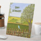 A pedestal with a beautiful image of a nature scene: A bird sitting on a weathered fence, wildflowers growing around the fence, a farmer on a tractor, working his land, trees with leaves, and farmland with various colors. Original artwork by W.B.