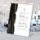 Le bord gauche de cet élégant panneau d'accueil est doté d'une bordure en aquarelle noire ornée d'une parties scintillant en faux or. Une fausse croix de feuille d'or apparaît au-dessus du texte personnalisable, qui combine l'écriture manuscrite, les polices cuivre et italique en gris fusain sur un arrière - plan blanc. Personnalisez-le avec le nom de l'invité d'honneur et la date. Idéal pour la première communion d'un garçon.