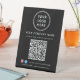 Upgrade your counter, reception desk, or checkout area with this custom QR code black pedestal sign, designed to help customers instantly connect with your business. Featuring a clean background, modern white lettering, and your logo, business name, and Facebook and Instagram social media handle, this professional tabletop sign fits seamlessly into retail stores, salons, studios, cafés, clinics, offices, and service-based businesses. With one quick scan, customers can view your services, pricing, menu, or website -- no typing required. Zazzle automatically generates the QR code from the website address you enter. The sturdy pedestal base keeps the sign upright and highly visible, while the minimalist design reinforces your brand and creates a polished, contactless experience. Perfect for promoting your website, encouraging social media follows, and streamlining customer communication, this personalized QR code sign is both functional and stylish.