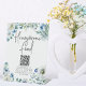 Fleurs de pivoines blanches gaies et feuilles d'aquarelle verte forment une belle frontière sur ce joli guéridon de fonds de lune de miel pour un mariage de printemps. Chic, moderne griffe manuscrite accentuée par un joli design floral bleu cornflower. Ajoutez le lien de votre site Web au code QR.