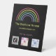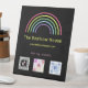Restez connecté avec des clients ou des groupes en utilisant ce panneau de pédale de table qui présente un graphique en arc-en-ciel néon avec du texte personnalisable et des codes qr de médias sociaux sur arrière - plan noir