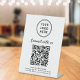 Panneau de table moderne "connectez-vous avec nous" pour votre entreprise avec votre code QR pour que les clients scannent pour effectuer un paiement, pour une liste de vos produits, services et prix, pour des rendez-vous, pour s'inscrire, etc. Téléchargez votre logo et votre code QR et ajoutez le nom de votre entreprise, votre numéro de téléphone, votre adresse ou d'autres informations dans une typographie simple. Libérez le potentiel d'une interaction accrue avec les clients et d'un accès transparent à votre site web ou à votre plateforme en ligne.