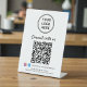 Panneau de piédestal de table moderne "connectez-vous avec nous" pour votre entreprise avec votre code QR pour que les clients scannent pour effectuer un paiement, pour une liste de vos produits, services et prix, pour des rendez-vous, pour s'inscrire, etc. Téléchargez votre logo et votre code QR et ajoutez le nom de votre entreprise, votre numéro de téléphone, votre adresse ou d'autres informations dans une typographie simple. Ajoutez vos identifiants d'utilisateur instagram et facebook pour que les clients vous suivent sur les réseaux sociaux.