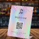 Rosée, violette, verte à la menthe, fond holographique décoré de confettis. Avec le texte : Bienvenue. Personnalisez et ajoutez le logo de votre entreprise, le code QR et le texte.