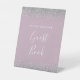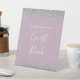 Un panneau chic et élégant pour que les clients mariages invitations signent leur livre d'or. Les mots "Livre d'Invité" apparaissent en calligraphie d'écriture blanche sur un arrière - plan lilas poussiéreux, avec des bordures de parties scintillant argent en haut et en bas.