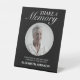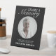 Cet élégant panneau noir Partager une mémoire est une belle et réfléchie façon d'encourager les invités à partager leurs souvenirs d'un être cher à un service commémoratif ou à la célébration de la vie. Le design simple et élégant comprend une photo circulaire du défunt, un message sincère invitant les clients à partager une mémoire et un nom personnalisé.