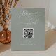 Cette enseigne élégante couleur vert QR code honeymoon de fonds est parfaite pour une simple douche mariage ou nuptiale. Le design minimaliste moderne présente un vert pastel intemporel et une calligraphie romantique au style conte de fées bohème. Personnalisez votre signature de code QR de registre de lune de miel avec vos noms.