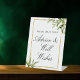 Ce mariage botanique vert et élégant signe de piédestal est encadré par de beaux feuilles d'aquarelle verte et des vignes d'olivier et un cadre rectangle d'or. Cette belle palette de verdure et de couleurs sombres est parfaite pour un événement d'automne haut de gamme pour une mariée classe à l'automne.
