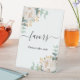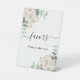 Fond blanc. Décoré de fleurs blanches, feuilles d'eucalyptus aquarelles vertes, brindilles, verdure, feuilles dorées fausses. Avec le texte : faveurs, prenez-en une !