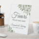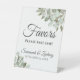 Ce joli panneau de table est conçu pour invitation vos invités à prendre une faveur de mariage. Il présente un design simple mais élégant avec des lettres de script sophistiquées et des sprigs peints à la main de feuilles d'eucalyptus et de verdure dans les tons menthe, mousse et vert sauge. Le panneau dit : Faveurs, prenez-en une ! Il y a de la place pour vos noms et la date du mariage ci-dessous.