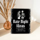 Apportez une torsion éffrayante à votre douche nuptiale avec ce squelette gothique d'Halloween "Date Night Ideas". Doté d'élégantes polices gothiques et de squelettes amusants, ce panneau invitation les invités à partager leurs suggestions de dates amusantes et ludiques pour le couple heureux. Parfait pour ajouter une touche unique à une douche de mariée sur le thème de l'Halloween, ce panneau est à la fois élégant et hantant, donnant le ton parfait pour un événement mémorable. 💀 💀 💀