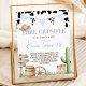 Printable First Rodeo time capsule sign for a cowboy-themed first birthday. Features cow print, blue gingham bunting, cowboy hat, boots, cactus, wooden signs, and rustic western illustrations. Guests can write wishes, predictions, and messages for the birthday boy to open at age 18. Perfect for western rodeo party decor, keepsakes, and memory table displays.