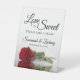 Ce joli panneau de table est parfait pour une table de régal à votre réception de mariage. Il présente un design simple mais élégant avec une photo d'une seule rose rouge à long tige réfléchissant dans un bassin d'eau avec des vagues et des ondulations. Le panneau dit : L'amour est doux, s'il vous plaît prenez un régal! Il y a de la place pour vos noms et la date du mariage ci-dessous.