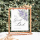 Soft lavender florals layered with sage green foliage create an elegant guest book sign designed for romantic garden weddings.