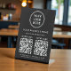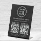Panneau de piédestal de table noire moderne et professionnel pour votre entreprise. Téléchargez votre logo et 2 codes QR pour les clients afin de rechercher le paiement, l'information, une liste de vos produits, services, prix, etc. Étiquette les codes QR et ajoutez votre nom d'entreprise, numéro de téléphone, adresse de rue, site Web ou d'autres informations dans une simple typographie blanche.