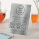 Moderne et professionnel, socle de table en faux métal argenté brossé pour votre entreprise. Téléchargez votre logo et 3 codes QR pour que les clients les scannent pour paiement, informations, liste de vos produits, services, prix, etc. Étiquetez vos codes QR et ajoutez le nom de votre entreprise, numéro de téléphone, adresse, site web ou autres informations en typographie simple.