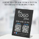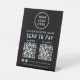 Simple panneau de piédestal noir de table moderne pour votre entreprise avec les codes QR Venmo et Paypal pour que les clients scannent pour les paiements. Ajoutez votre logo, codes QR, nom de l'entreprise, numéro de téléphone et site web dans une typographie blanche simple. Ajoutez vos identifiants utilisateur instagram et facebook pour que les clients vous suivent sur les réseaux sociaux.