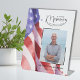 Un panneau de piédestal funéraire est muni d'un drapeau américain aquarelle avec la photo, le nom, les dates de naissance et de mort de votre être cher sur le devant. CORRESPONDANCE d'objets dans notre collection.