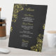 Un moyen simple d'informer vos clients sur le menu mariage. Cela montre les options de premier, deuxième plat et dessert. Un menu noir classique avec des tourbillons et des fleurs en faux or. Il est facile de customiser avec vos choix de menu, mais contactez-moi si vous avez besoin d'aide pour le faire. Ceci fait partie d'une collection de produits coordonnés et assortis pour un mariage noir et or élégant.