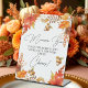 Un élégant panneau de douche nuptiale avec rouille automne floral, feuilles d'érable, glands et élégante calligraphie.