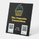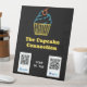 Écran moderne et élégant de paiement par code QR option tabletop piédestal pour votre stand de cupcake, boulangerie ou stand de marché fermier, avec un cupcake néon sur arrière - plan noir. Ajoutez votre code qr personnalisé et les détails de l'entreprise.