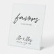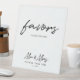 Un simple arrière - plan blanc minimaliste et un texte de script noir "favorise" signe de table mariage pour encourager votre invité à prendre une faveur de mariage.