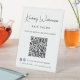 Signe de tablette de socle personnalisable pour votre entreprise avec votre nom dans un script de signature élégant et type d'entreprise ci-dessous dans une typographie moderne simple. Entrez l'adresse URL de votre site Web pour créer un code QR pour les clients et les clients à rechercher une liste de vos produits, services, heures, etc. Ajoutez vos identifiants instagram et facebook pour que les clients puissent vous suivre sur les médias sociaux. Si nécessaire, ajustez la taille de la police en modifiant l'outil de conception. Un panneau de signalisation de fenêtre correspondant est également disponible - envoyez-nous un message pour le lien.