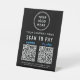 Panneau de piédestal noir moderne pour votre entreprise avec les codes QR Venmo et Paypal pour les clients à scanner pour les paiements. Entrez les liens vers Venmo et Paypal pour créer des codes QR pour les clients à analyser pour les paiements. Ajoutez votre logo et votre nom commercial, votre numéro de téléphone et votre adresse de rue dans une simple typographie blanche.