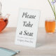 Ce design élégant et élégant comporte le message "Please Take a Seat". Il dispose également d'un professionnel/clinique/entreprise/organisation/etc. sur mesure. nom. Cela pourrait être utilisé dans un coin salon ou un salon pour informer les clients, les visiteurs ou les clients qu'ils seront servis sous peu et qu'ils devraient prendre place entre-temps.