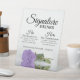 Ce panneau de table est parfait pour le bar à votre réception de mariage. Il présente un design simple mais élégant avec une photo d'un seul rose à long tige violet clair ou lavande réfléchissant dans un bassin d'eau avec des vagues et des ondulations. Le panneau indique : Signature Drinks, et il y a de l'espace pour son préféré et son préféré.