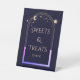 Sweets and Tras Mystical Rainbow Dark Navy Blue Sun Moon Stars Astronomie Celestial Cosmic Galaxy Space Mariage Event Piédestal Sign présente un soleil, une lune et des étoiles de couleur arc-en-ciel sur un arrière - plan bleu marine foncé. À l'intérieur, il y a votre texte personnalisé. Conçu pour vous par ©2024 Evco Studio www.zazzle.com/store/evcostudio