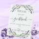 Arrière - plan blanc élégant, décoré de fleurs de lavande, de fleurs et de verdure d'eucalyptus. Texte : S'il vous plaît, signez notre livre d'or et laissez vos meilleurs voeux pour le nouveau monsieur m. mrs avec un coeur.