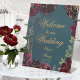 Un ton turquoise de bijou bleu "Bienvenue à notre Mariage", enseigne de piédestal mariage autoportante, qui présente une symphonie de pivoines rouges framboises bordeaux profondes agrémentées de spray doré et de contours dorés scintillants se rassemblent autour d'un arrière - plan bleu profond de l'aquarelle avec vos noms et accueillant dans un scénario rustique et animé de mariage or.