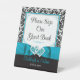 Maintenant que vous avez trouvé l'amour de votre vie et que vous planifiez votre mariage, n'oubliez pas d'obtenir une signalétique mariage personnalisée qui correspond à votre schéma de couleurs bleu et noir turquoise ou turquoise. Ce guéridon mariage damassé en noir et blanc présente des images d'une paire de coeurs unis au-dessus d'un ruban bleu turquoise et une image d'arc traversant la partie inférieure du panneau. Les noms de la mariée et du marié et la date du mariage sont imprimés en bleu turquoise et blanc sous l'image du ruban. Le libellé personnalisable au-dessus du ruban dit, "S'il vous plaît signer notre livre d'invité" en script noir, mais vous pouvez changer cela pour dire ce que vous voulez. Si vous avez besoin d'autres articles correspondants, envoyez votre demande par courriel à niteowlstudio@gmail.com ou utilisez la fonction conversation Zazzle pour entrer en contact.