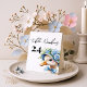l'histoire d'une étape joyeuse — le tout premier anniversaire, une célébration enveloppée d'amour, de chaleur et d'une touche de fantaisie. Le design est centré autour d'une oie charmante, illustrée avec amour comme si elle avait été arrachée des pages d'un livre pour enfants adoré. Ce n'est pas n'importe quelle oie — c'est « une oie idiote », habillée pour une fête dans un chapeau rayé et une couronne de fleurs, tenant fièrement un ballon bleu. Son expression est les yeux écarquillés, innocente et pleine de personnalité — tout comme un enfant d'un an découvrant le monde.
