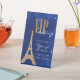 Accessoire de fête à thème chic Paris VIP signe de table réservé, réalisé en bleu roi avec des étoiles blanches sur l'arrière - plan et des graphiques d'une gloire dorée regardant la Tour Eiffel. Le texte du graphique de la parties scintillant d'or est VIP, le reste du texte étant fait en blanc et prêt à être personnalisé. Matches out Paris thème Sweet 16 Anniversaire invitations et produits de fête.