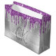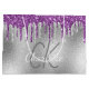 Ein Imitat silber metallisch aussehender Hintergrund mit lila Imitaten Glitzer Tropfen, Farbe Tropflook. Personalisieren und fügen Sie einen Namen und Monogramm-Initialen hinzu. Der Name ist mit einem modernen handgeschriebenen Stilskript geschrieben. Weiße und graue Buchstaben. Ideal für Geburtstage, Brautparty, Babydusche.