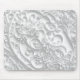 Eine Kollektion von aufwändig gestaltetem, silbergrauem Papier, das dunkle Blume und wirbelnde Motive auf weißem Hintergrund abhält.