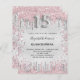 Eine moderne, stilvolle und glamouröse Einladung für eine Girl's Quinceañera, 15. Geburtstagsfeier. Ein Imitat silber aussehender Hintergrund, dekoriert mit rosa und Imitaten silberne Glitzer Staub. Personalisieren Sie Ihren Namen und Ihre Party-Daten und fügen Sie diese hinzu. Nummer 15 wird mit einem Schriftart im Ballonstil geschrieben, Skript.