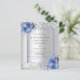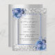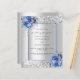 Imitat silber aussehend mit blauen Rose, Blume und Konfetti dekoriert. Personalisieren und fügen Sie Ihre Namen und Hochzeitsdetails. Schwarze Buchstaben. 1 Blatt = 1 Einladung mit Druckkante bis Kante.