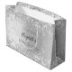 Eine Geschenktasche für ein mädchenhaftes und glamouröses Brautparty. Ein Imitat silber aussehender Hintergrund mit Imitaten silberne Konfetti, Glitzern. Personalisieren und fügen Sie ein Datum, Name. Der Name ist mit einem modernen handgeschriebenen Stilskript geschrieben.