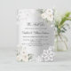 Eine moderne, elegante Einladung zur Erneuerung des Geldes. Ein silbernes Imitat mit weißen Blumen, Rose und weißen Spitzen. Personalisieren Sie Ihre Namen und Details und fügen Sie diese hinzu.