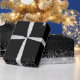 Elegantes, klassisches, glamouröses und feminines Party-Packpapier. Ein schwarzer Hintergrund mit Imitaten verziert silberne Glitzer Tropfen und funkeln. Ideal für Geburtstage und Weihnachtsgeschenke.