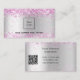 Ein Imitat silber aussehender Hintergrund. Dekoriert mit rosa Konfetti. Personalisieren und fügen Sie Ihr Firmenlogo und einen Text auf der Vorderseite. Zurück: Vorlagen für Ihren Namen, Titel, Telefonnummer und Ihren eigenen QR-Code.